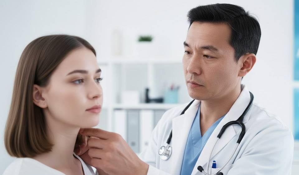 • Κατά την εξέταση, ελέγχεται ο λαιμός και ψηλαφώνται οι λεμφαδένες για να διαπιστωθεί εάν είναι διογκωμένοι.